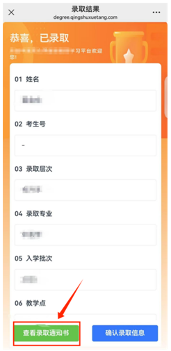 3. 页面显示新生个人信息, 点击“查看录取通知书 ”。