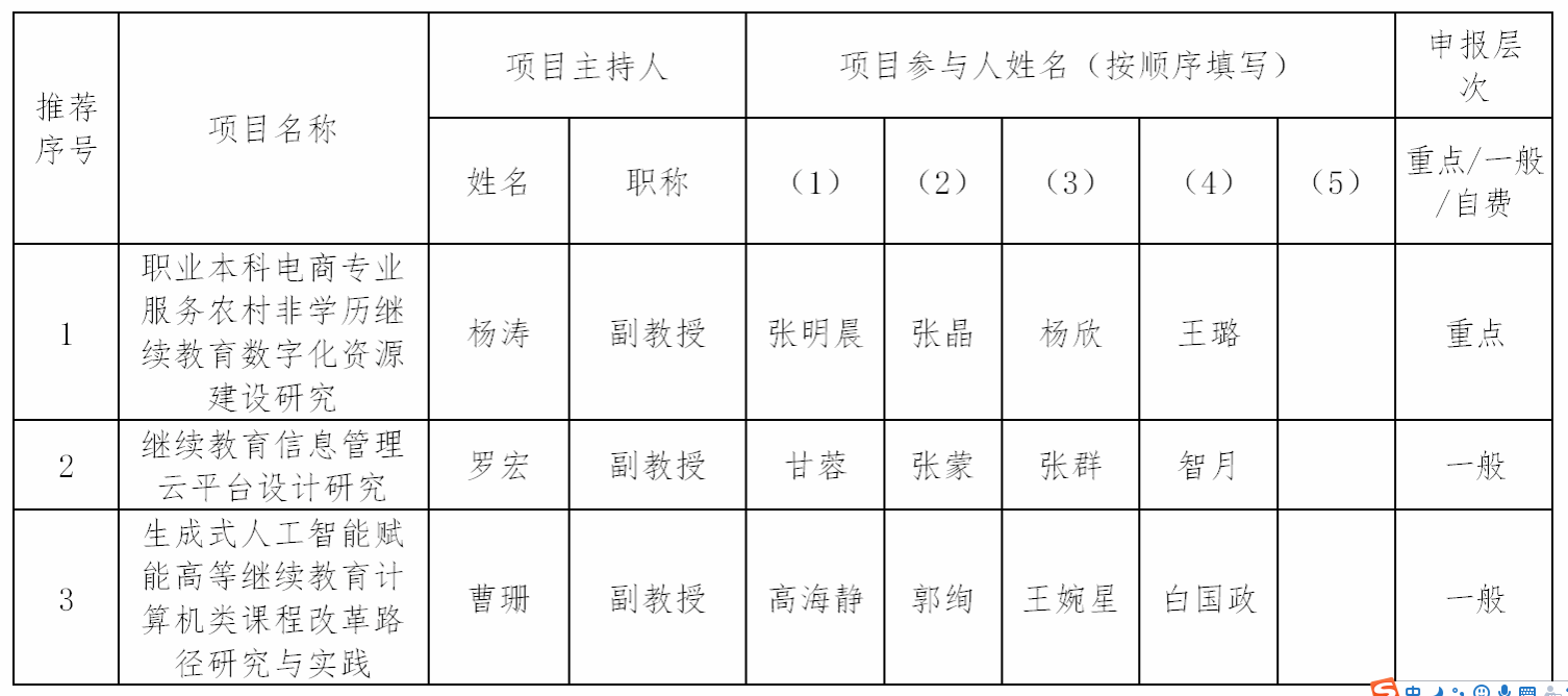 根据陕西省高等继续教育学会《关于做好2025年度陕西高等继续教育教育教学改革研究项目申报工作的通知》(()字〔202531)文件要求,经个人申报、资格审查、专家评审,拟推荐《职业本科电商专业服务农村非学历继续教育数字化资源建设研究》等3个项目申报2025年度陕西高等继续教育教育教学改革项目。
