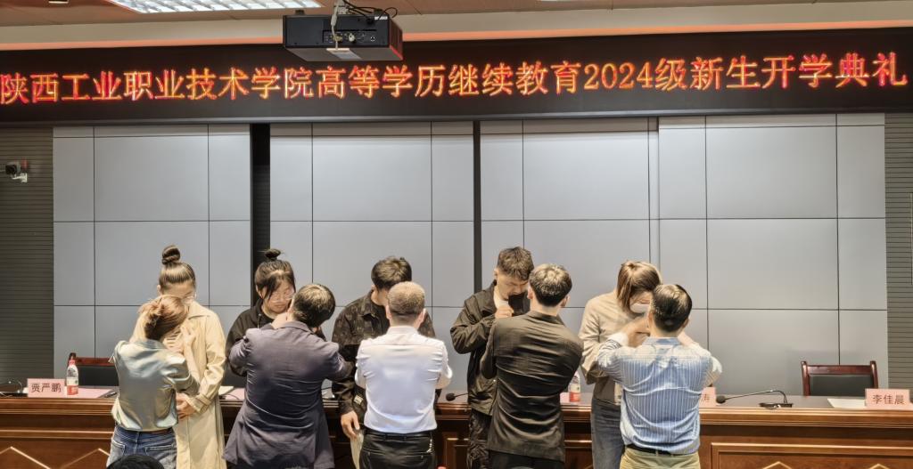 随后,新生代表上台发言,她表达了对未来的期待和信心,并表示将努力学习专业知识,积极参加校园活动,为学院争光添彩,不辜负学院和家长的期望。紧接着,继续教育与培训学院领导为新生代表佩戴了校徽。这一仪式象征着新生们正式成为陕西工业职业技术学院的一员,他们也将肩负起传承学院精神、续写辉煌篇章的重任。