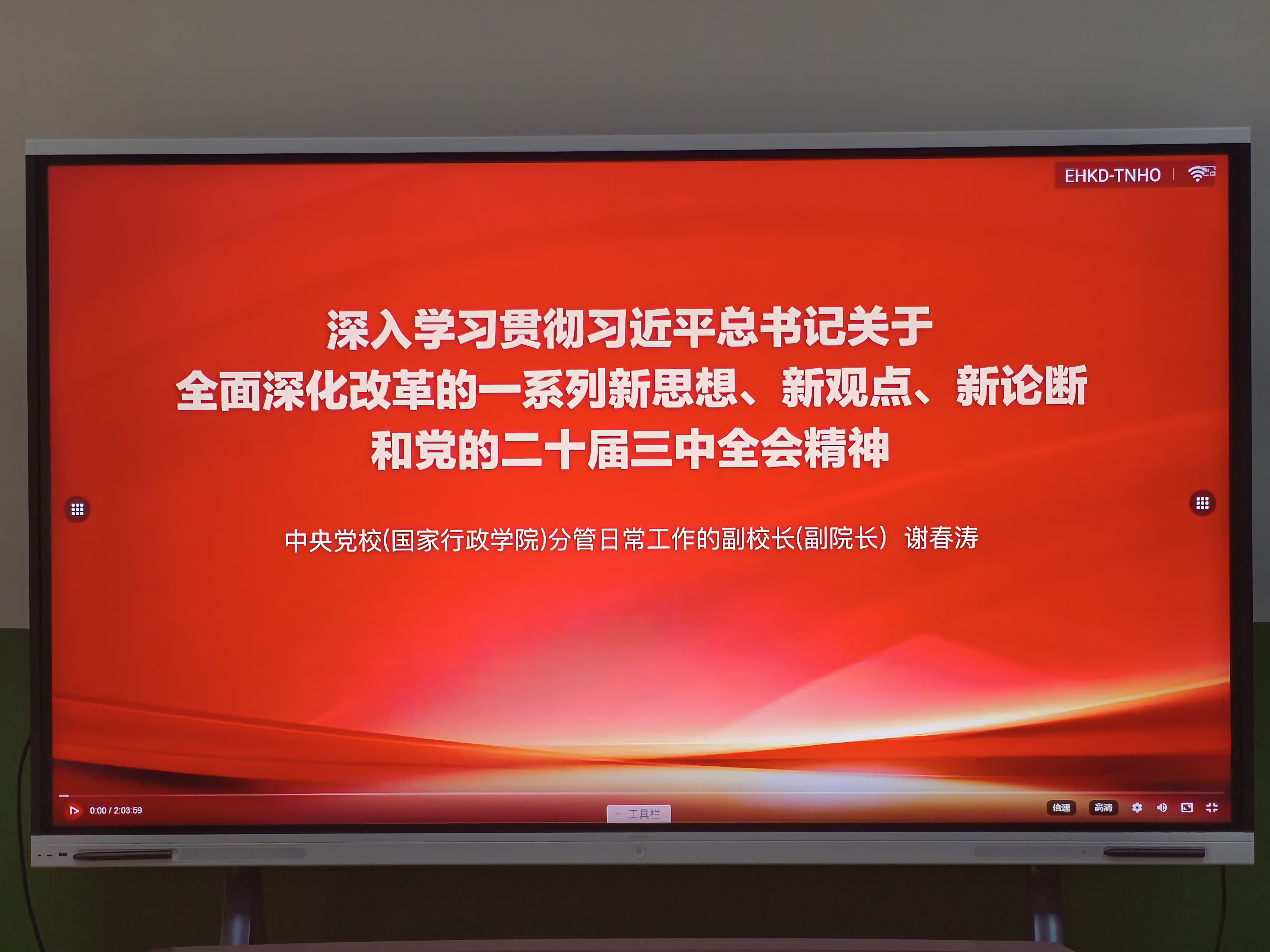 为深入学习贯彻党的二十届三中全会精神,近期,继教国际党支部书记贾严鹏组织处科级以下党员、群众观看学习了中央党校谢春涛副院长的视频课程---“深入学习贯彻习近平总书记关于全面深化改革的一系列新思想、新观点、新论断和党的二十届三中全会精神”。