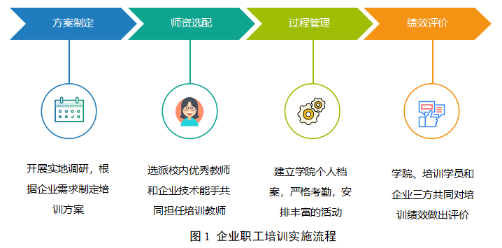 一是主动对接,构建协同机制。学院与政府和企业积极对接,在培训过程中做好“四种角色”。一是做政策研究员,协助有关部门制定相关政策文件。二是做政企校联络员,与多方紧密联系,做好政策、需求、标准等信息传导工作。三是做项目规划员,组织骨干教师开展调研分析,为企业量身打造培训方案并指导实施。四是做好实施辅导员,在立项和实施过程中对企业进行全方位指导,确保项目有序实施。