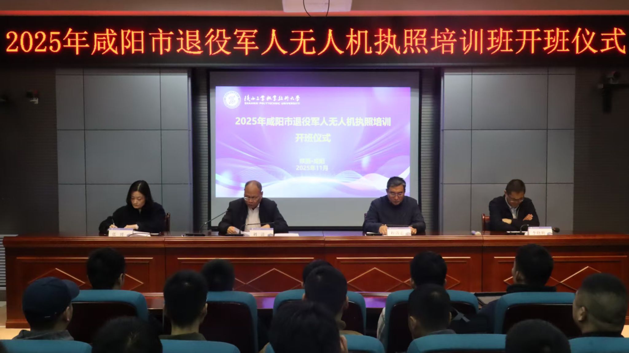 2025年11月6日,由咸阳市退役军人事务局主办、陕西工业职业技术大学承办的2025年咸阳市退役军人无人机执照培训班在我校正式启动。咸阳市退役军人事务局副局长程清志、就业创业科科长张瑾,我校副校长刘清、航空工程学院院长李晓鹏,培训班管理人员、退役军人学员共四十余人出席开班仪式。